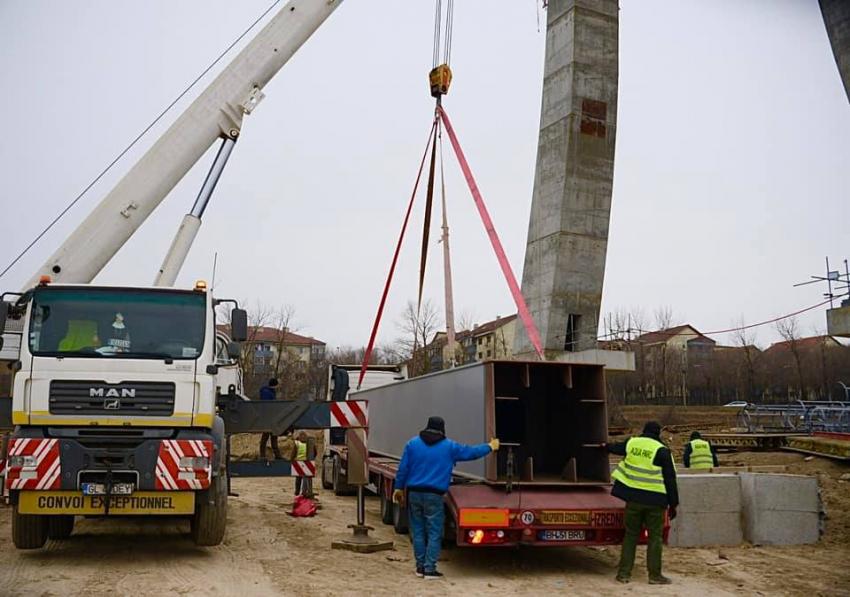 "În această dimineață, au ajuns la Galați, pe șantierul podului hobanat, primele piese metalice. Este vorba de construcții metalice de peste 45 de tone și lungimi de aproximativ 15 metri, care vor fi montate la pilonul central. În afara acestora, la finalul acestei saptămâni mai sunt așteptate și alte componente metalice, astfel încât, după montarea lor, să se continue înălțarea pilonului central până la 62 de metri.De altfel, pilonul central este singurul element al podului la care mai trebuie turnat beton. Rând pe rând, la Galați vor ajunge și celelalte părți metalice, inclusiv elementele de tablier", a transmis președintele Consiliului Județean Galați, Costel Fotea.