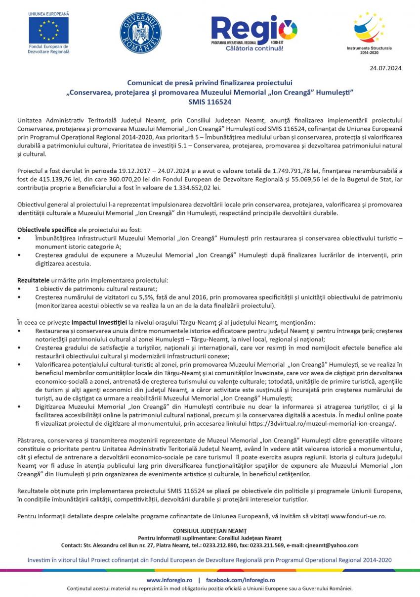 UAT Neamț a finalizat proiectul „Conservarea, protejarea și promovarea Muzeului Memorial Ion Creangă”. Finanțarea a fost asigurată cu sprijinul fondurilor europene, asigurate prin Programul Operațional 2014-2020