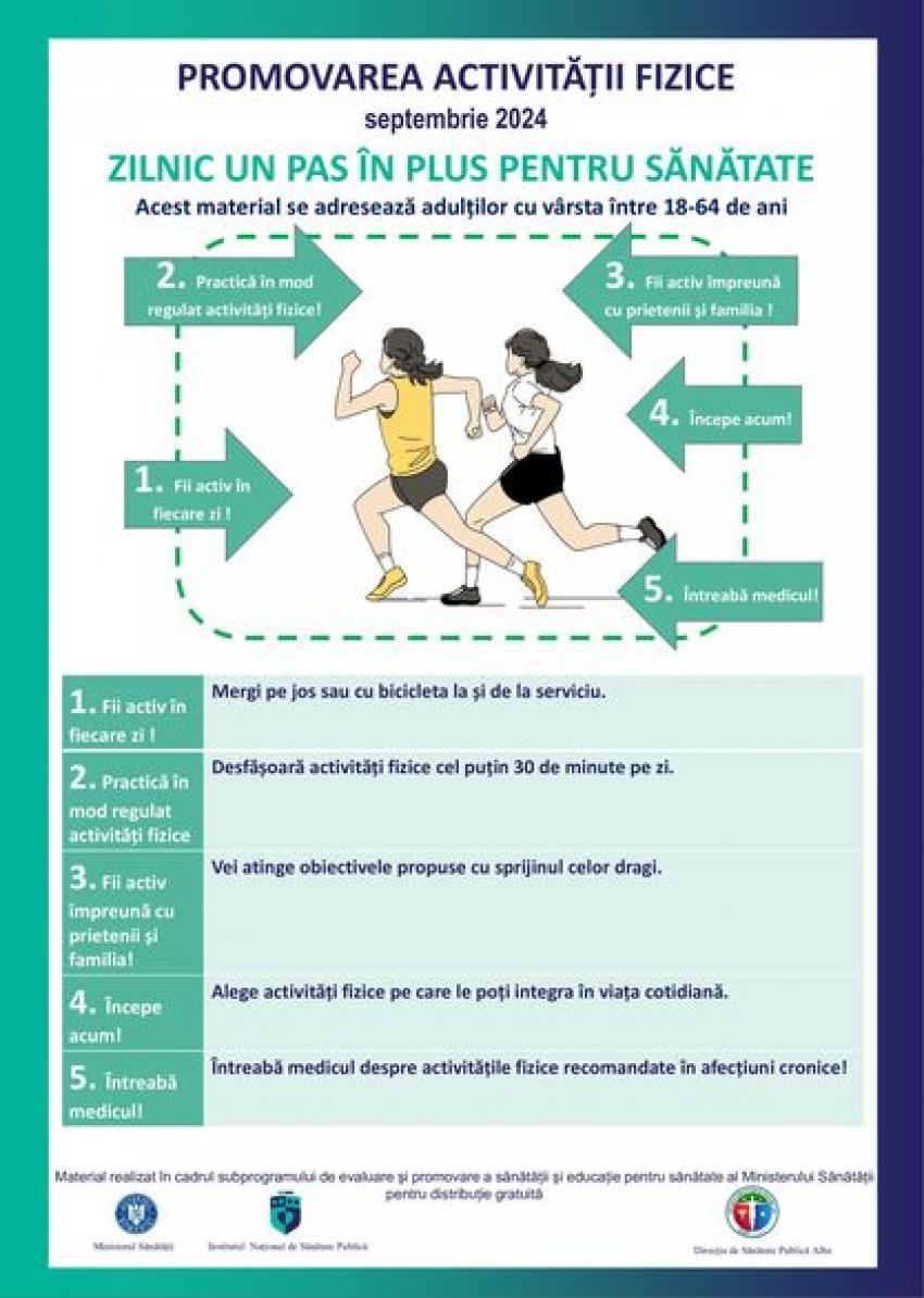 Direcția de Sănătate Publică a județului Alba în parteneriat cu Consiliul Judeţean Alba derulează, în luna septembrie, campania „Zilnic un pas în plus pentru Sănătate”, a cărei temă urmărește prevenirea sedentarismului în rândul adulților și tinerilor.
